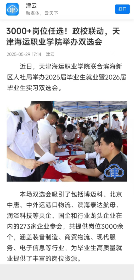 5月29日,津云客户端发表文章《3000+岗位任选!政校联动,天津海运职业学院举办双选会》,报道天津海运职业学院举办2025届毕业生就业双选会暨2026届毕业生实习双选会。