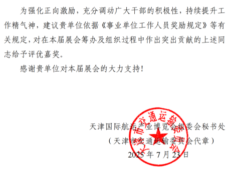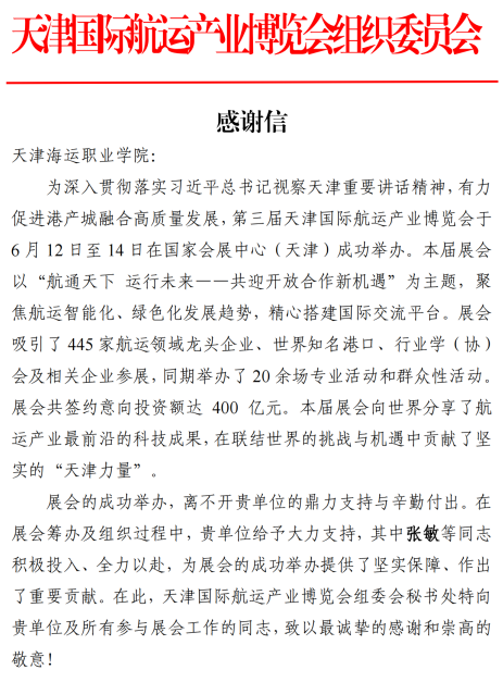 近日,天津海运职业学院收到来自第三届天津国际航运产业博览会组委会秘书处的感谢信。信中高度肯定了学院对博览会成功举办所做出的“鼎力支持与辛勤付出”,特别赞扬了张敏等同志在展会筹办及组织过程中“积极投入、全力以赴”的表现,为展会提供了“坚实保障、作出了重要贡献”。