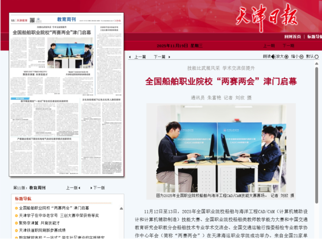 11月19日,《天津日报》刊发文章《技能比武展风采 学术交流促提升 全国船舶职业院校“两赛两会”津门启幕》,报道2025年全国职业院校船舶与海洋工程CAD/CAM(计算机辅助设计和计算机辅助制造)技能大赛、全国职业院校船舶类教师教学能力大赛和中国交通教育研究会职教分会船舶技术专业学术交流会、全国交通运输行指委船检专业教学协作中心年会(简称“两赛两会”)在天津海运职业学院成功举办。