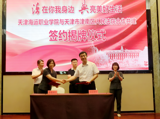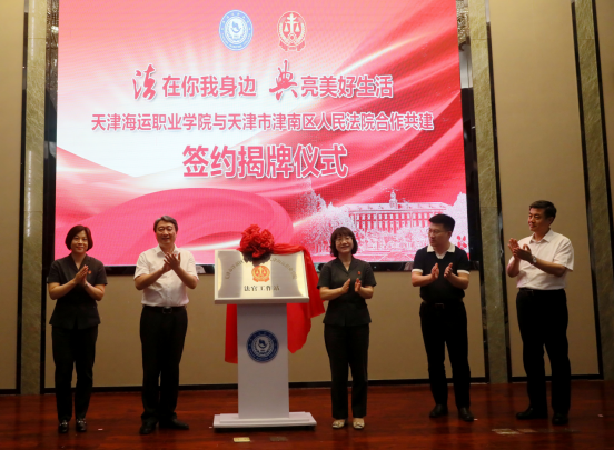 5月29日,天津海运职业学院与天津市津南区人民法院合作共建签约暨“天津市津南区人民法院驻天津海运职业学院法官工作站”揭牌仪式在学院举行。天津市教育委员会法制处处长邢建涛,天津市津南区人民法院党组书记、院长安文杰,天津市津南区人民法院党组成员、政治部主任李晓燕,学院党委书记陈昀,党委副书记王军出席。津南区人民法院办公室负责同志,学院法治工作领导小组成员单位负责同志和师生代表参加了活动。
