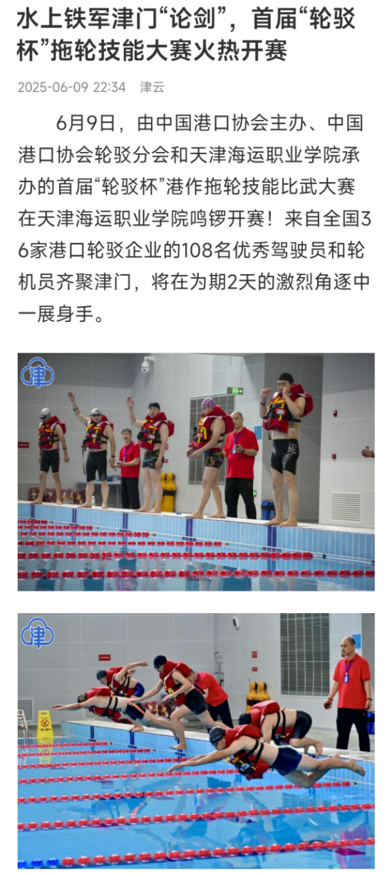6月9日,由中国港口协会主办,中国港口协会轮驳分会和天津海运职业学院承办的首届“轮驳杯”港作拖轮技能比武大赛在天津海运职业学院开赛。来自全国36家港口轮驳企业的108名优秀驾驶员和轮机员展开激烈角逐。