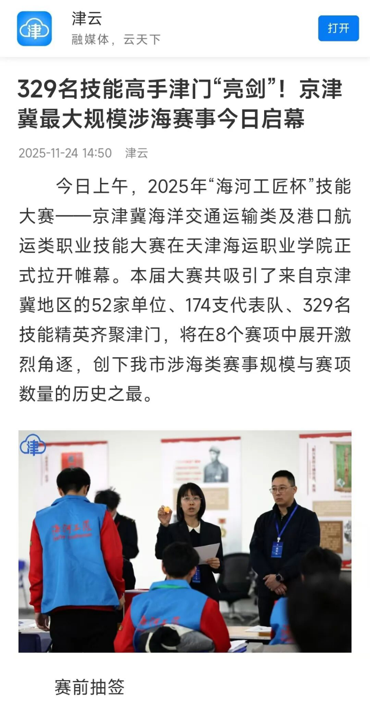 11月24日-25日,2025年“海河工匠杯”技能大赛——京津冀海洋交通运输类和港口航运类职业技能大赛在天津海运职业学院举行。大赛汇聚了来自52家单位的174支队伍、329名选手同台竞技,创下了天津市涉海类赛事规模与赛项数量的历史之最。本次大赛既是检验专业本领的竞技舞台,更是彰显职业风采、传承工匠精神的生动课堂,全面契合京津冀协同发展以及港产城深度融合发展的战略需求,是落实科教兴市和人才强市战略的生动实践。