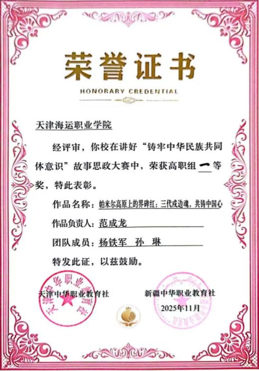 近日,由天津中华职业教育社与新疆中华职业教育社联合主办,天津渤海职业技术学院、乌鲁木齐职业大学共同承办的讲好“铸牢中华民族共同体意识”故事思政大赛决赛,在新疆乌鲁木齐职业大学圆满落幕。此次比赛共计36所院校的71部作品参赛,经初赛推选、复赛专家网上评审,马克思主义学院张雅欣老师团队作品《大漠微光为国成炬——二十五载坚守浇筑中华民族进步之路》、宋艳老师团队作品《共御外侮:从瓦氏夫人抗倭到全民族抗战的中华民族共同体叙事》荣获高职组三等奖,范成龙老师团队作品《帕米尔高原上的界碑红:三代戍边魂共铸中国心》从众多参赛作品中脱颖而出,成功入围22个现场展示决赛作品,并在激烈角逐中勇夺高职组一等奖第一名,实现了历史性突破。
