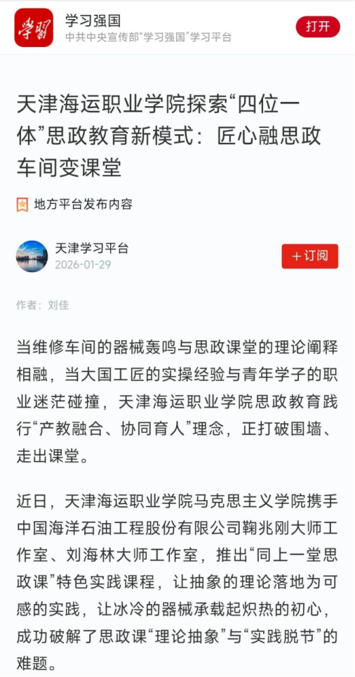 1月29日,学习强国天津学习平台发布文章《天津海运职业学院探索“四位一体”思政教育新模式:匠心融思政 车间变课堂》,报道天津海运职业学院马克思主义学院携手中国海洋石油工程股份有限公司鞠兆刚大师工作室、刘海林大师工作室,推出“同上一堂思政课”特色实践课程。