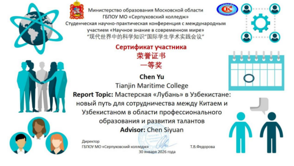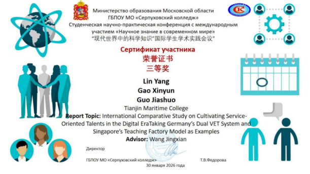 近日,2026年“现代世界中的科学知识”国际学生学术实践会议在俄罗斯莫斯科圆满落幕。在此次国际盛会上,来自天津海运职业学院的两支学生团队凭借出色的表现,从多国参赛者中脱颖而出,分别斩获一等奖、三等奖,不仅充分彰显海运师生卓越的研究能力与开阔的国际视野,更以实际行动积极落实天津上合峰会深化职业教育合作精神,以及高质量举办“中俄教育年”活动,在国际职教舞台奏响天津强音。