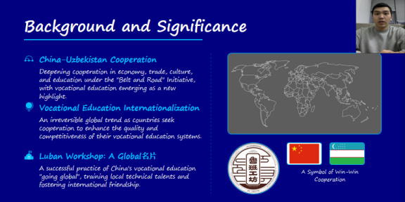乌兹别克斯坦鲁班工坊进修生陈宇,在指导教师陈思远的悉心指导下,以《乌兹别克斯坦鲁班工坊:中乌职业教育合作与人才培养新路径》为题,进行了精彩的学术报告。报告中,陈宇系统且深入地阐述了作为中国职业教育“走出去”典范的“鲁班工坊”模式,如何与“一带一路”倡议深度融合,为沿线国家培养本土化技术技能人才。该报告紧扣时代主题,合作逻辑清晰,具有积极的国际意义,最终荣获大会一等奖。