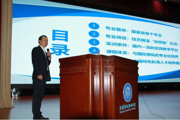 在职业引领篇中,天津市惠通海员管理服务有限公司资深轮机长王守谊作《从甲板到机舱——一名老轨的航海人生》主题讲座。王老轨结合三十余年航海经历,生动诠释了“人船合一”的工匠精神,强调“把小事做到极致”的职业态度,激励新生在平凡岗位上成就不凡人生。