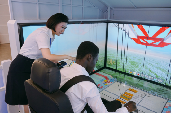 步入S16馆天津综合展区,四块巨型屏幕组成的港口起吊机训练模拟器前排起长龙。这套高仿真设备,成为市民体验智慧港口作业的“人气王”。“屏幕上下左右都有,有重力、线缆前后左右晃动的感觉。”体验后的市民王先生兴奋表示,“模拟真实感超强,特别新鲜!”该设备通过1:1仿真驾驶舱和高精度物理引擎,精准复现岸桥、场桥作业场景。它不仅用于港口专业课程教学,更让公众直观了解集装箱装卸、散货调运等操作流程,是产教融合的典型成果。这套模拟系统只是学院服务港产城融合的缩影,学院通过“可触可感”的体验,拉近了航运产业与普通市民的距离,呼应了天津“以港促产、以产兴城”的融合发展路径。