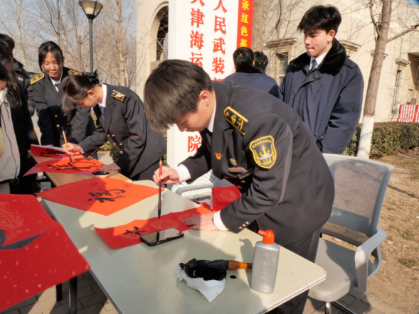 活动现场暖意融融,墨香四溢。国防教育实践协会的同学们化身“校园书法家”,挥毫泼墨间尽显青春风采。他们以马年文化为灵感,以强军兴邦为内核,将“骏马奔腾守边关,钢枪紧握护家园”“铁血军魂凝壁垒,奔腾马力壮河山”等兼具时代气息与传统韵味的联语付诸笔端,既遵循“词性相对、平仄相谐”的非遗春联格律,又融入海运学子对国防教育的赤诚与担当。一副副红底黑字的春联不仅饱含“马到成功”的新春祝福,更镌刻着“强国必须强军,军强才能国安”的坚定信念,短短数语间,非遗文化的厚重底蕴与强军报国的壮志豪情相得益彰。