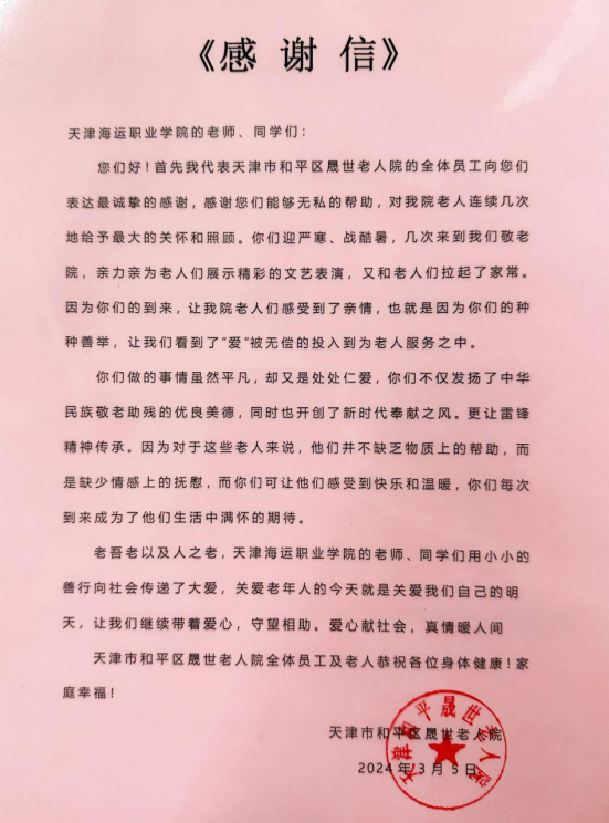 通过此次活动,让老人们既切实感受到来自社会的体贴与温暖,又弘扬传播了雷锋精神。晟世老人院也为此写下了“感谢信”,回馈并感谢我院全体师生在每次志愿服务当中付出的努力与坚持。未来,党委学生工作部(学生处)、共青团天津海运职业学院委员会将采用多种形式持续推进助老爱老活动,不断提升老年人的生活品质和幸福指数,让雷锋精神,在新时代闪闪发光。