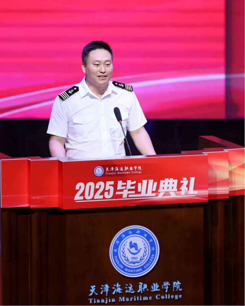 校友代表、学院2011届航海技术专业毕业生赵少华船长分享了自己在“知学善建 诚达思远”校训的影响下劈波斩浪、掌舵深海的经历,并勉励学弟学妹们保持敏锐的洞察力与持续的学习热情,以担当为帆,信念为舵,保持初心,勇往直前,早日在蔚蓝的大海上绽放出属于自己的光芒。