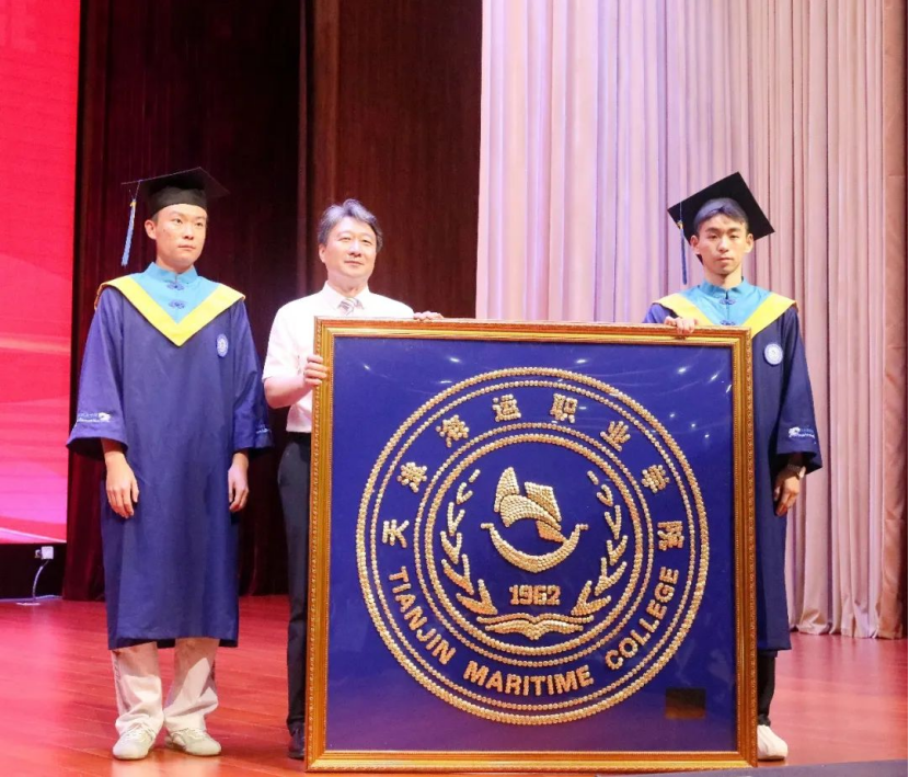 毕业生代表向母校赠送以校服扣子精心制作的校徽纪念品。党委书记陈昀代表学院接受镶嵌着毕业生们海运青春记忆的纪念品。